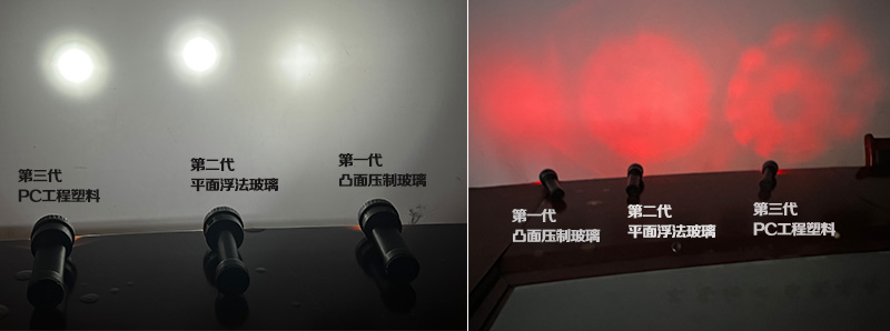 我們再(zài)來(lái)比對一下平麵浮法玻璃鏡(jìng)片和PC工程塑料(liào)鏡(jìng)片照射效果(左邊是三(sān)代PC工程(chéng)塑料(liào)鏡片 右邊是浮法玻璃鏡片)